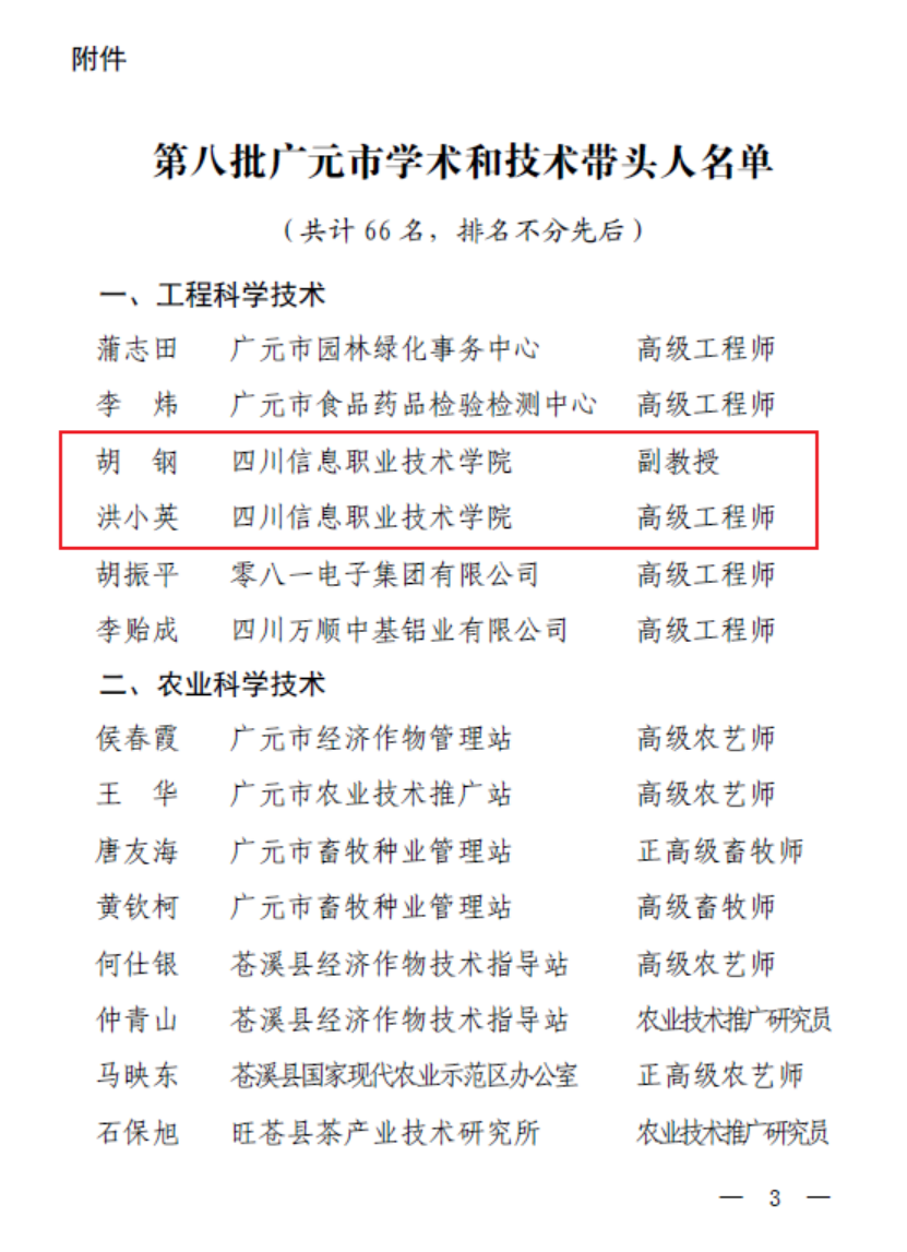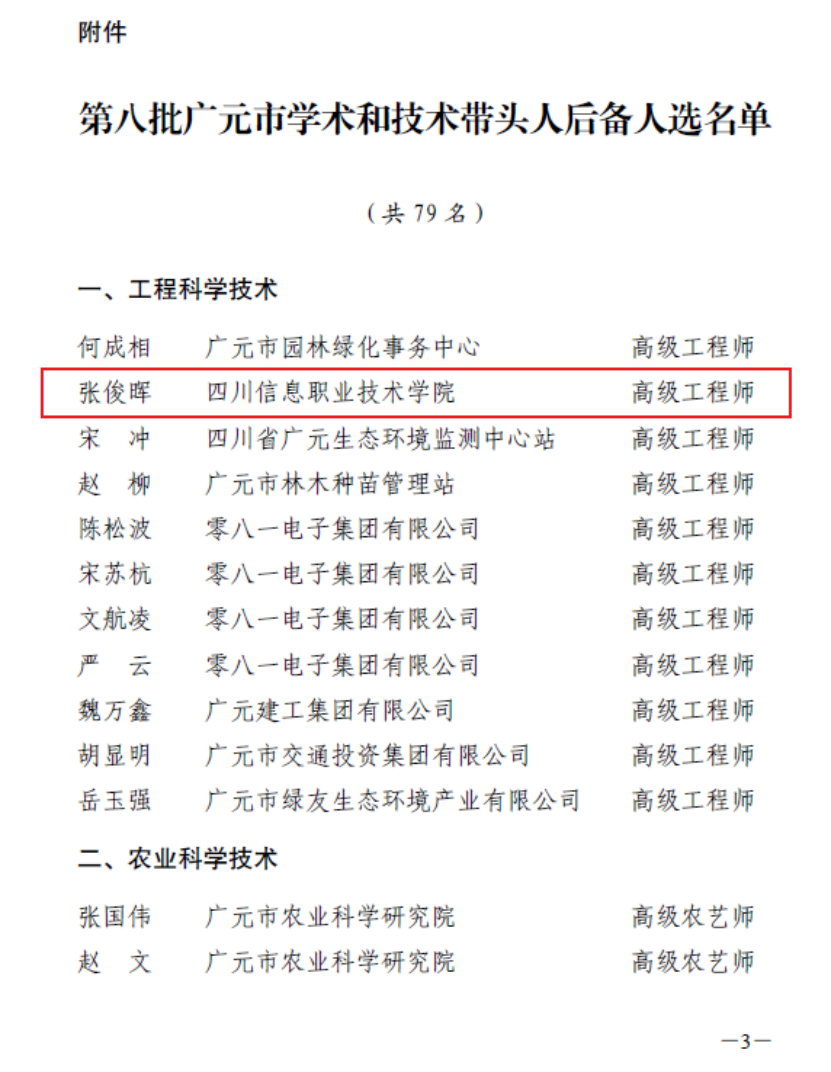 学院教师入选第八批广元市学术和技术带头人、学术和技术带头人后备人选名单