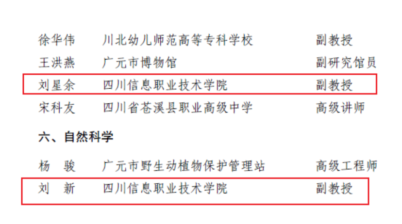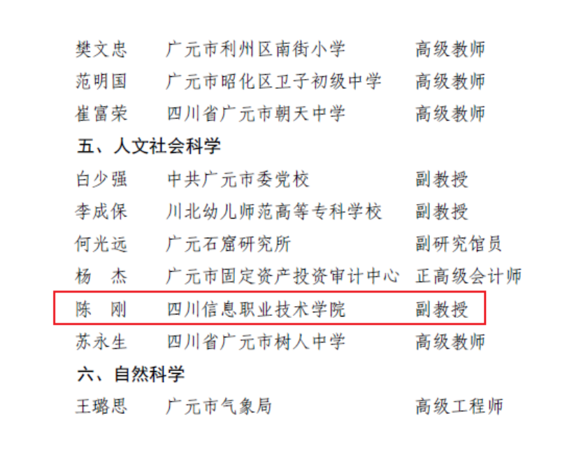 近日,在中共广元市委、广元市人民政府下发的《关于印发第八批广元市学术和技术带头人名单的通知》中,我院教师胡钢、洪小英、陈刚分别入选广元市工程科学技术、人文社会科学学术和技术带头人名单;在中国广元市委组织部、广元市人力资源和社会保障局、广元市委人才工作领导小组办公室下发的《关于公布第八批广元市学术和技术带头人后备人选名单的通知》中,我院教师张俊晖、刘星余、刘新分别入选广元市工程科学技术、人文社会科学和自然科学学术和技术带头人后备人选名单。